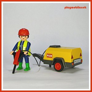 krásný dělník s pneumatickým kladivem a kompresorem, nesmí chybět na žádné stavbě!
