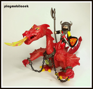 červený drak dštící oheň a síru se svým ukrutným jezdcem