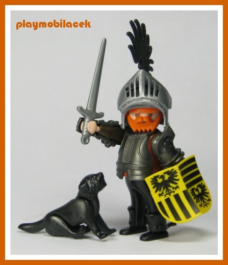 odbojný rytíř z 90. let v plné zbroji a se svým věrným psem