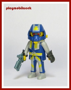 napůl playmobiláček a napůl stroj, ozbrojený kapitán kosmické lodi