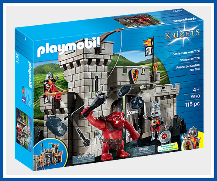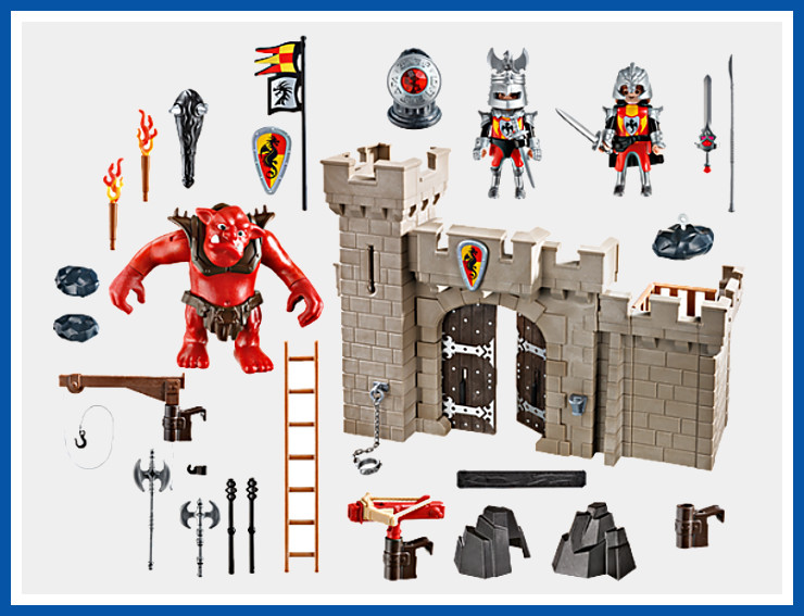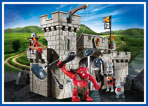 pěkný set hradní brány střežené dvěma rytíři a ochočeným rudým trolem