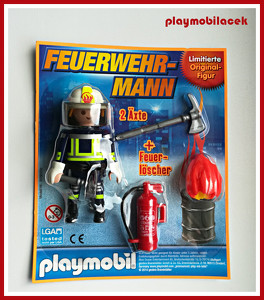 pěkný blister pack hasič se sekyrou, hasícím přístrojem a hořícím sudem